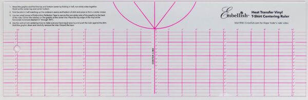 Use this ruler to perfectly center graphics on T-shirts, tote bags and any flat surface! Available in a 7” x 22” size.