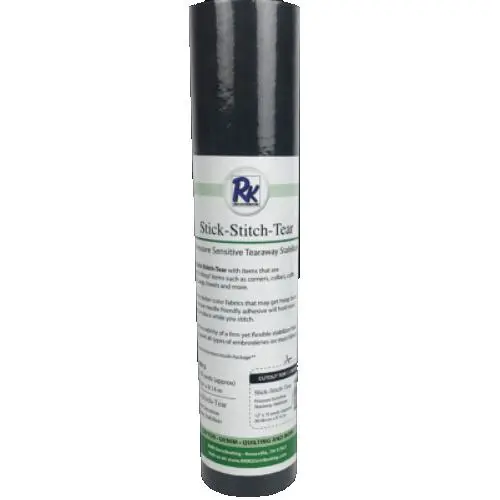 RNK Stick-Stitch-Tear in black is the perfect solution for your stitching and embroidery projects. This fusible tear-away stabilizer provides excellent support for machine embroidery, applique, and other delicate designs. It easily sticks to your fabric, ensuring stability while you work, and tears away cleanly once the stitching is complete. With a generous 10-yard roll and a 12″ width, it’s ideal for larger projects, giving you the reliability and precision you need for professional results.
